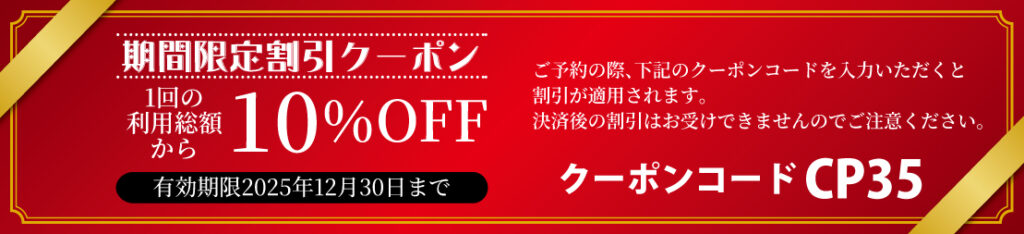 ご予約時に以下のクーポンコードをご入力いただくと割引が適用されます。